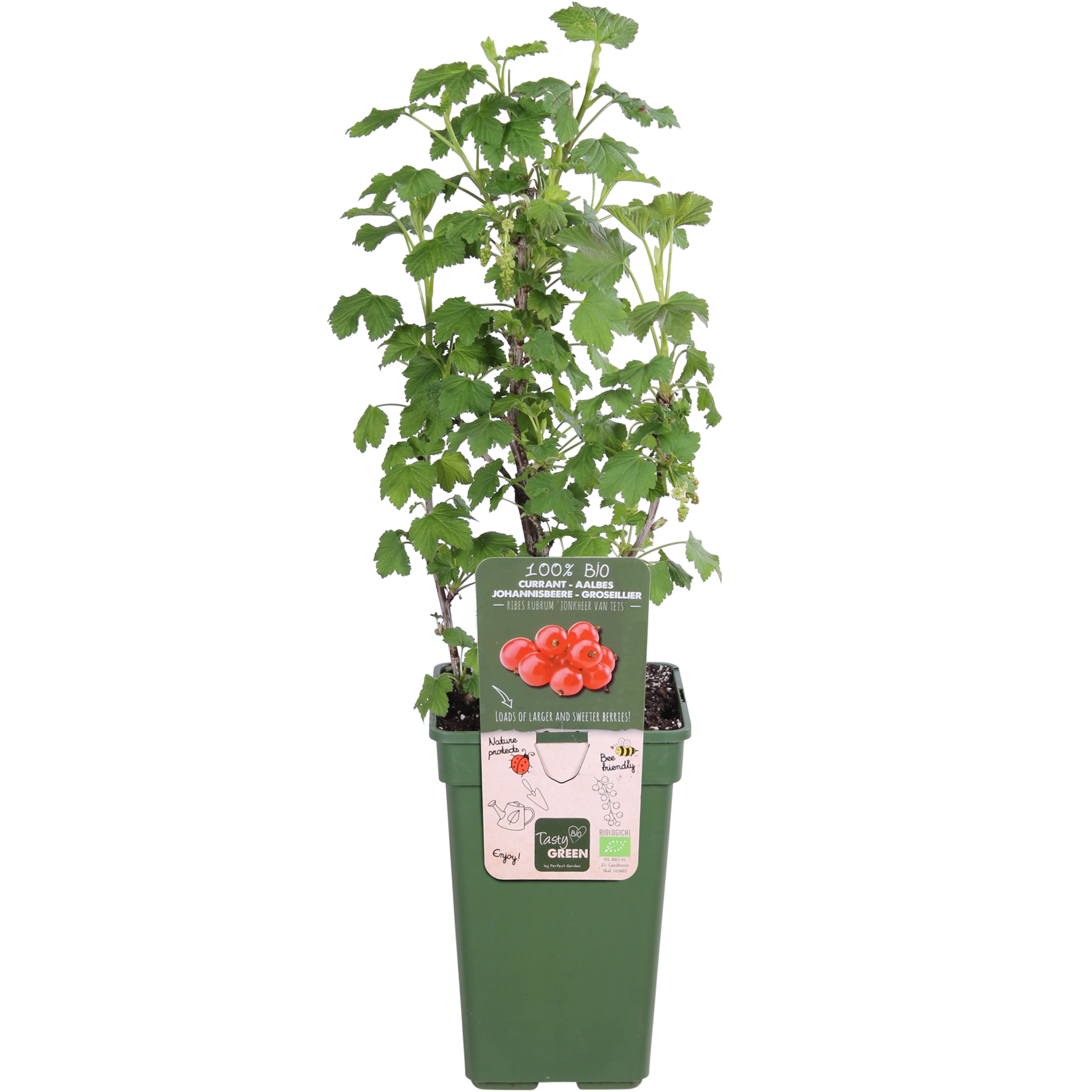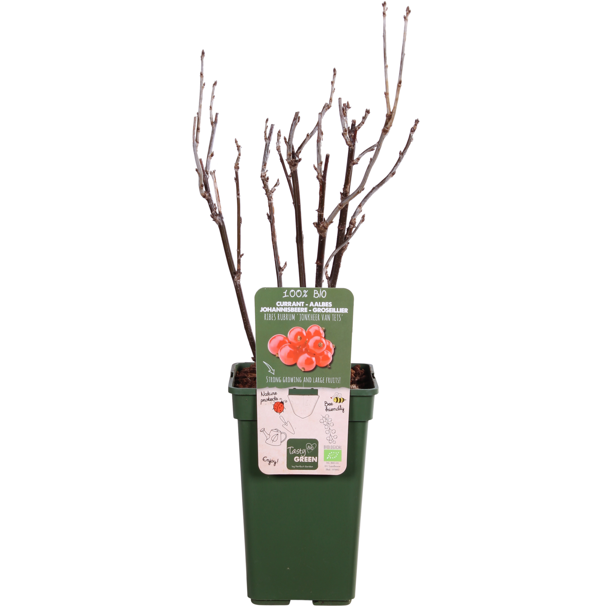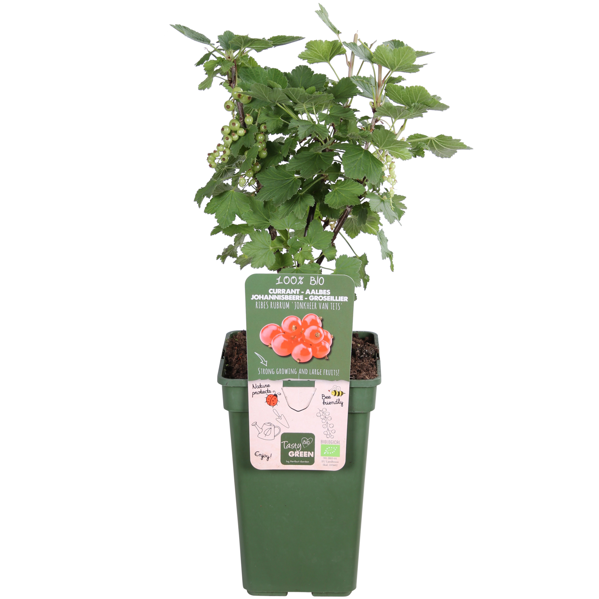 Tasty Green, 100% biologisch gekweekt fruit. Dat wil zeggen dat er tijdens de teelt uitsluitend plantaardige en dierlijke materialen gebruikt zijn. De pot en het etiket zijn gemaakt van gerecycled plastic en daarom een schone oplossing voor het milieu. ‘Ribes Rubrum Jonkheer van Tets’ is een rode aalbes. De struik groeit krachtig en heeft een hoge vrucht opbrengst. Het is een van de vroegst rijpende rode bessen, de bessen zijn al rond eind juni rijp. De bessen groeien in lange trossen en hebben een zure, maar frisse smaak. Je kunt ze bijvoorbeeld eten in vlaai of als jam. De struik bloeit in het voorjaar met kleine groen-witte bloemen.