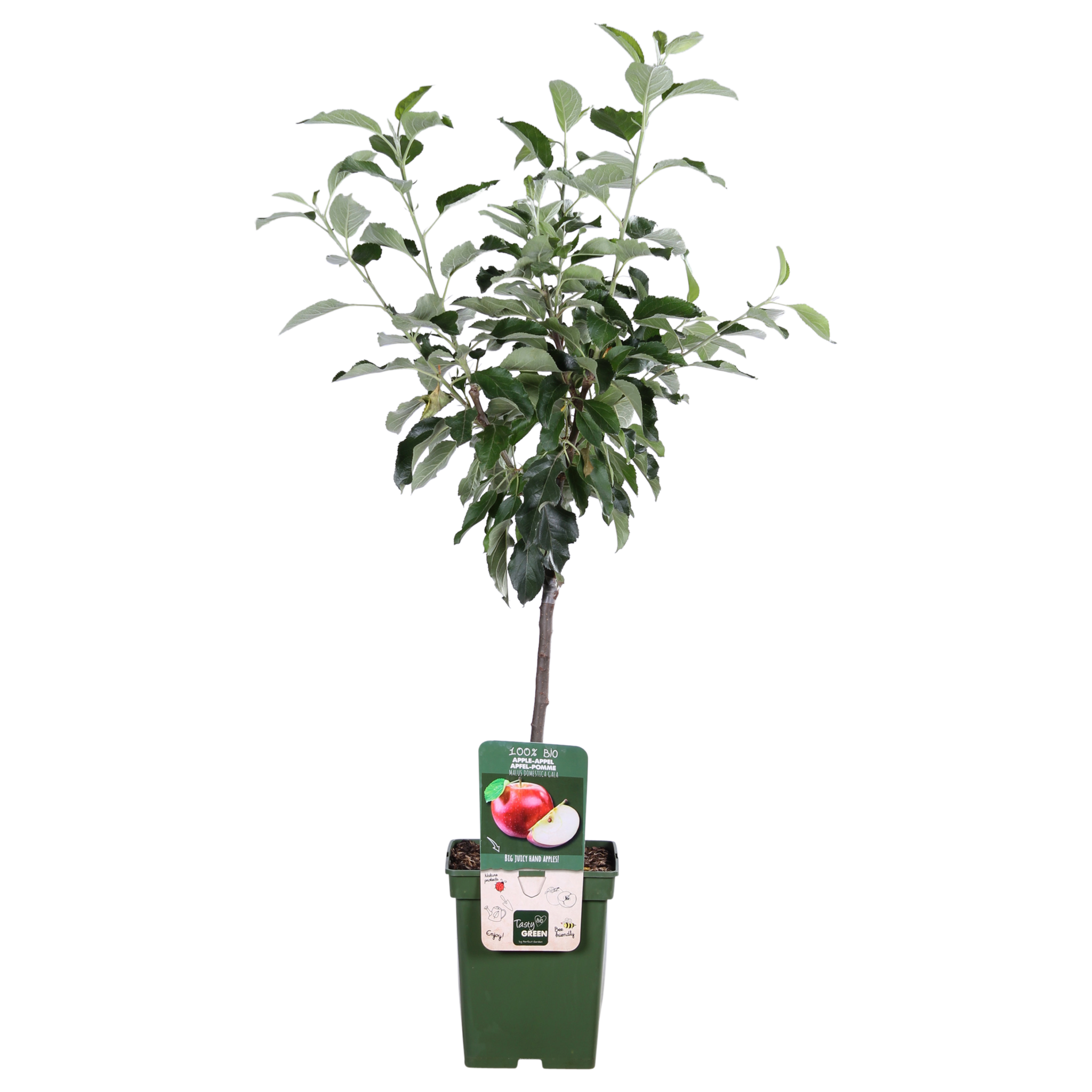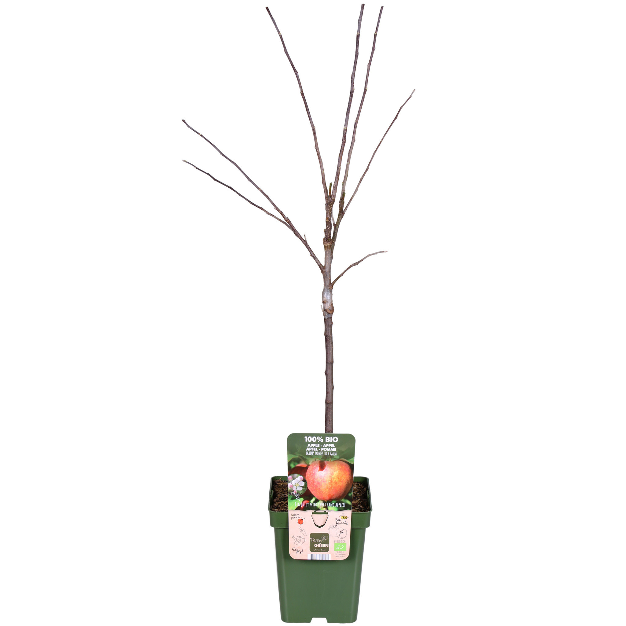 Tasty Green, 100% biologisch gekweekt fruit. Dat wil zeggen dat er tijdens de teelt uitsluitend plantaardige en dierlijke materialen gebruikt zijn. De pot en het etiket zijn gemaakt van gerecycled plastic en daarom een schone oplossing voor het milieu. ‘Malus Domestica Gala’ is een appelboom met sappige, zoete vruchten. Het lage zuur gehalte van de appel zorgt ervoor dat ook kinderen deze appel erg lekker vinden. De appels kunnen geplukt worden van eind september tot begin oktober en zijn redelijk goed bewaarbaar. De boom heeft het liefst een zonnige en beschutte plek en bij voorkeur in de buurt van een andere appelsoort voor de bestuiving.