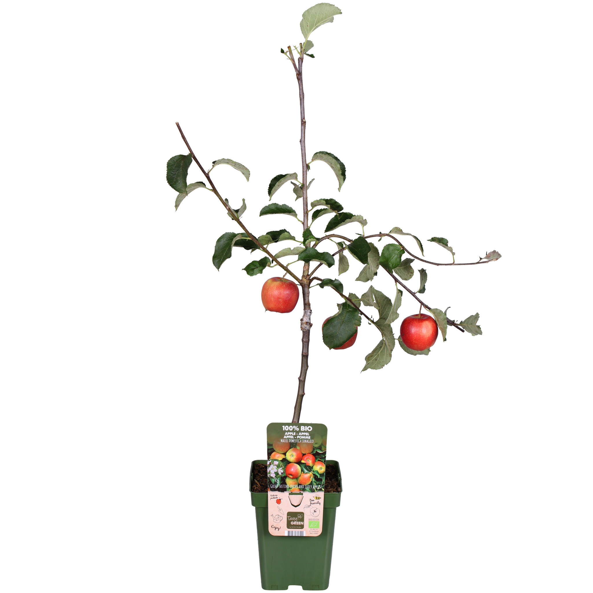 Tasty Green, 100% biologisch gekweekt fruit. Dat wil zeggen dat er tijdens de teelt uitsluitend plantaardige en dierlijke materialen gebruikt zijn. De pot en het etiket zijn gemaakt van gerecycled plastic en daarom een schone oplossing voor het milieu. ‘Malus domestica Jonagold’ is een erg bekende appelsoort. Geef de boom de ruimte om te kunnen groeien. Hij bloeit in april en mei met een wit-roze bloesem die uitgroeien tot smakelijke appels. De vrucht is groot en rood-geel van kleur met geel-wit sappig vruchtvlees. De smaak is wat zoet en zachtzuur. Appels bevatten veel voedingsvezels, vitaminen en antioxidanten.