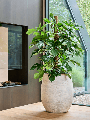 Onze basis opmaak bestaat uit semi hydro, dat betekent dat wij vanaf een potmaat van 20 centimeter en groter, de planten rondom de kwekersaarde afstrooien met hydrokorrels. Hierbij heeft u als extra keuze om een watermeter toe te voegen en of u de bovenkant van de pot wilt laten afstrooien met houtsnippers.