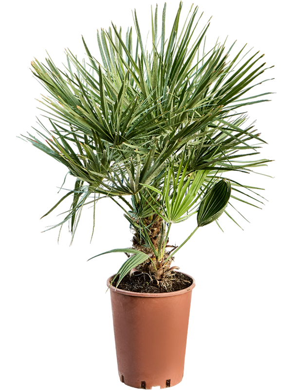 Zet een tropische plant als de Chamaerops op een lichte tot zonnige plek en geef wekelijks water. In de winter heeft de plant minder water nodig, dus geef dan 1x per 2 weken water. De Chamaerops heeft maar 1x per jaar extra voeding nodig, niet in de winter.