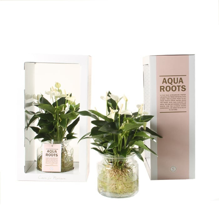 La plante Aqua Roots est entièrement débarrassée de terre. Les racines sont entièrement visibles à travers le verre dans lequel la plante se trouve. Il vous suffit de veiller à ce qu'il y ait suffisamment d'eau dans le verre. La plante est livrée avec des billes d'eau. Vous pouvez y laisser la plante ou les remplacer par de l'eau.