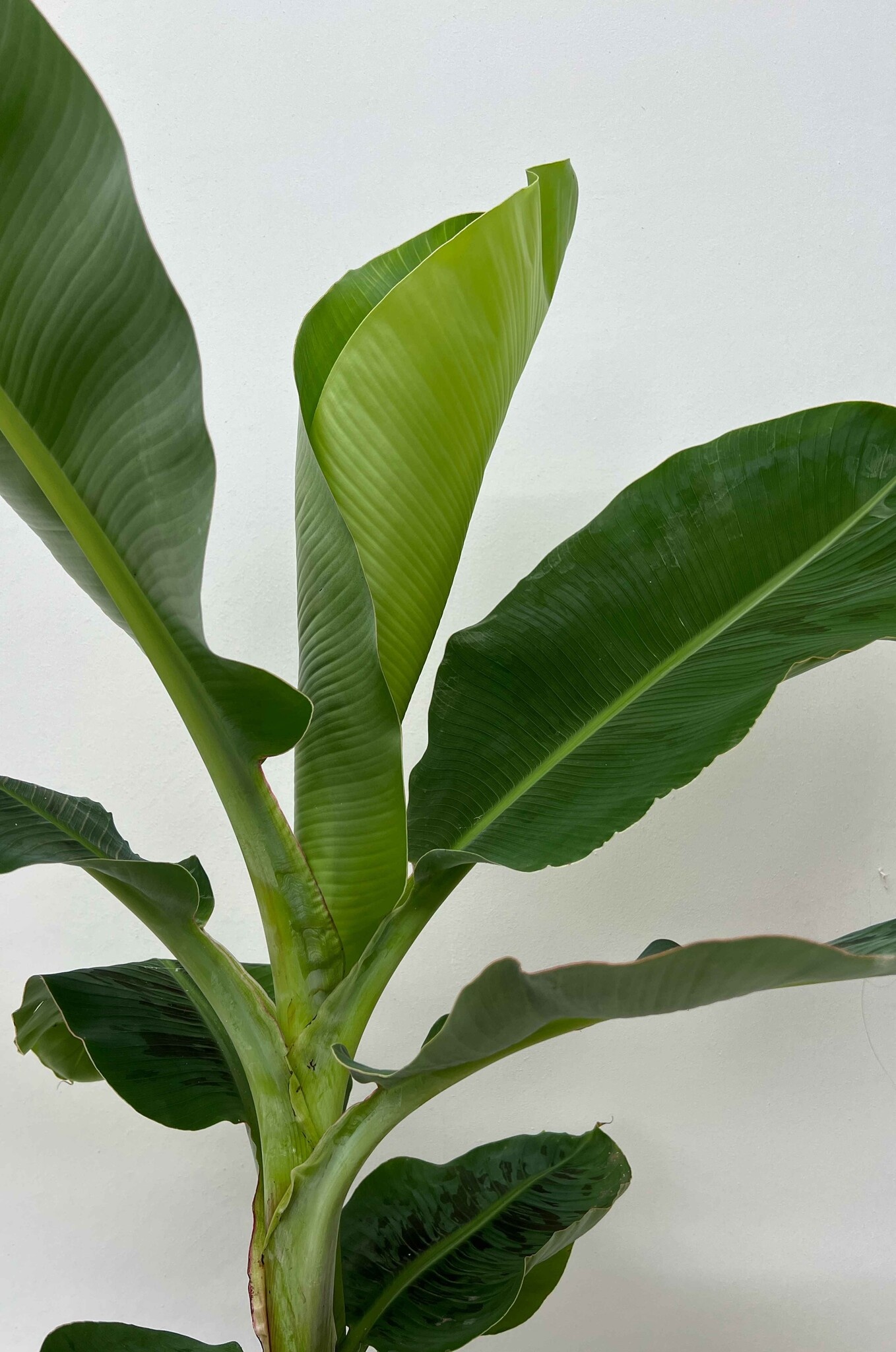 Le Bananier produit rapidement de nouvelles feuilles s'il est correctement entretenu. Comme le Bananier veut pousser en hauteur, la plante développe de nouvelles feuilles à partir du centre de la couronne. Comme toute l'énergie est concentrée dans la partie supérieure, le Bananier laisse tomber les feuilles inférieures. Si les feuilles inférieures sont encore attachées mais sont brunes, il est préférable de les couper près de la tige. Ainsi, la plante ne mettra plus d'énergie dans les vieilles feuilles et pourra mieux entretenir les feuilles en pleine croissance.