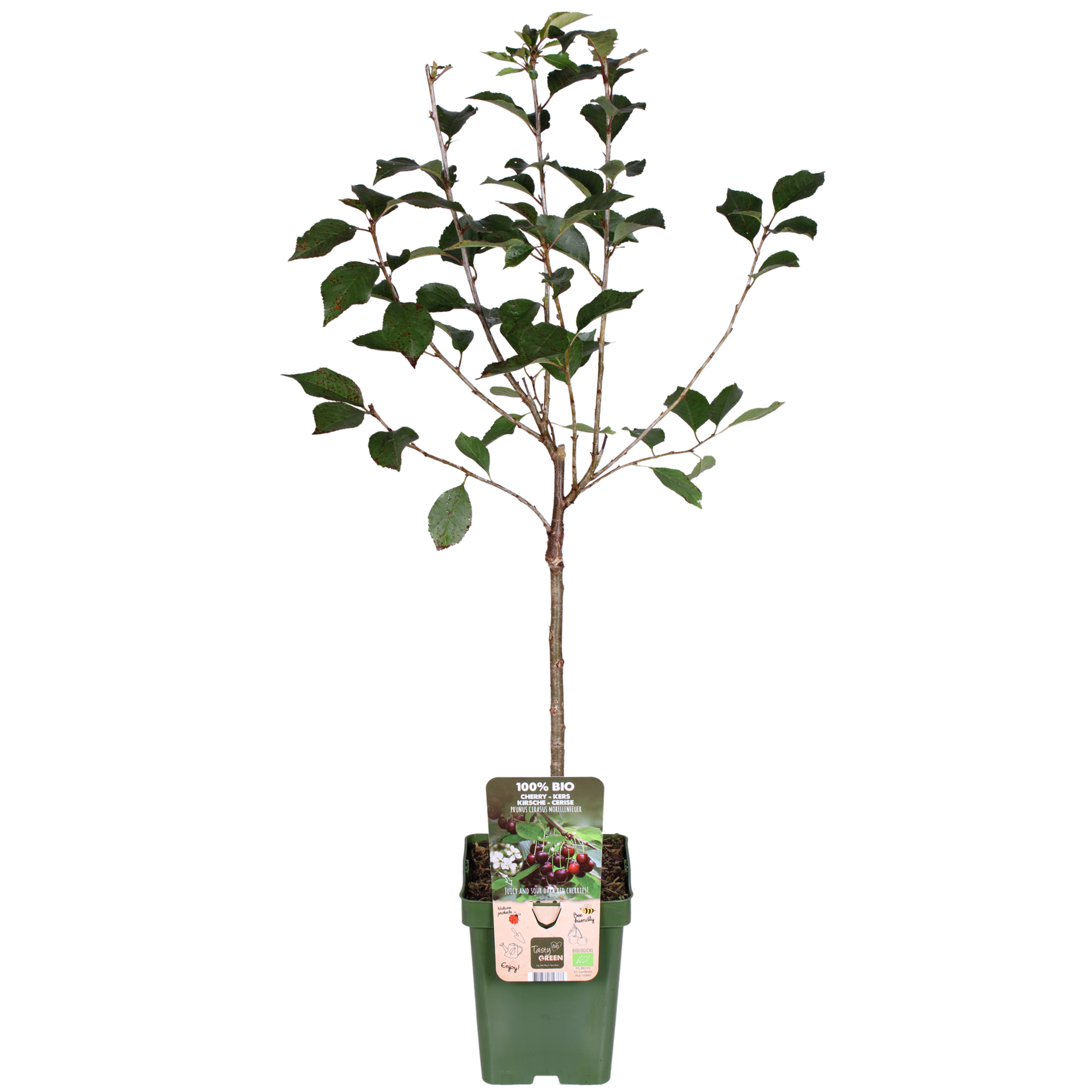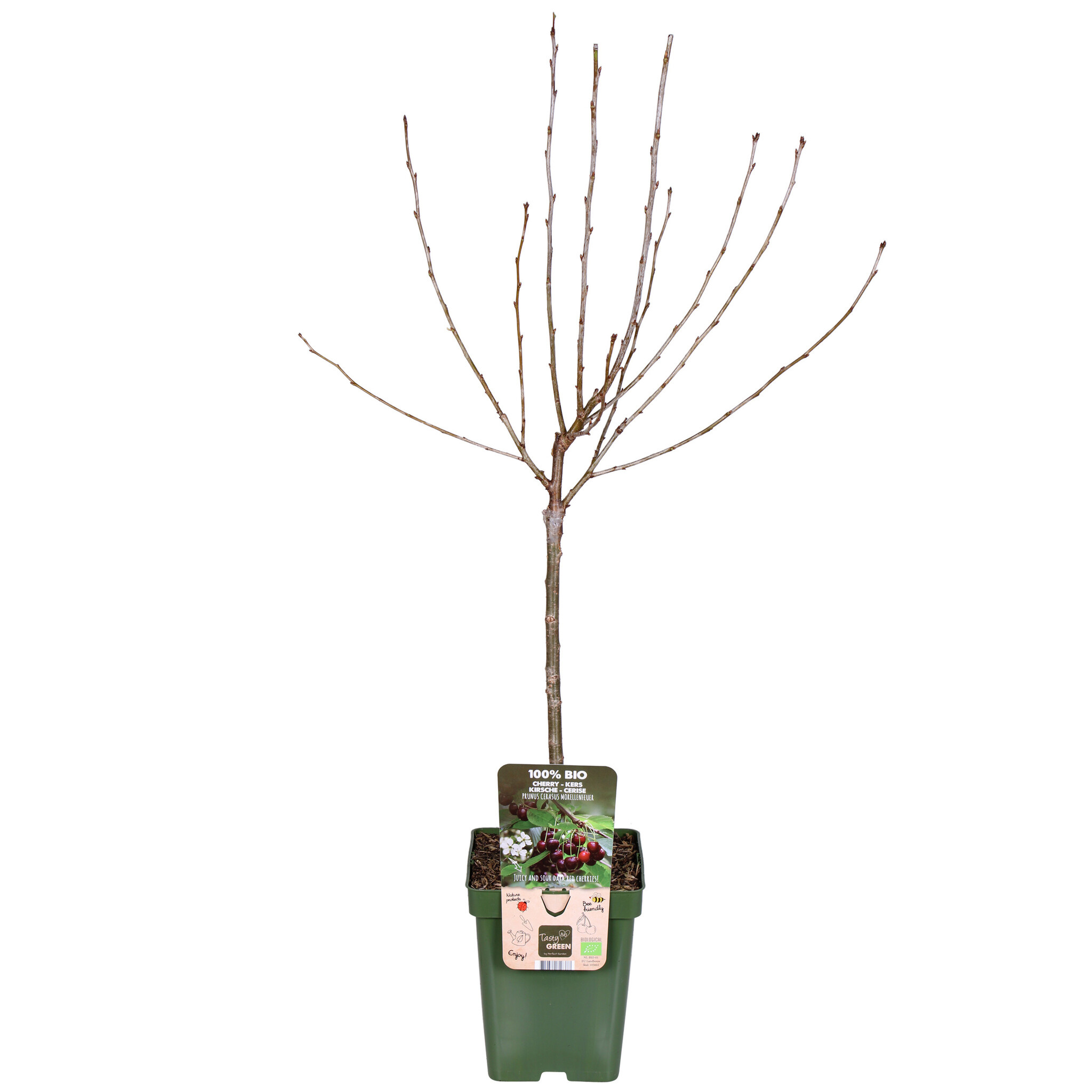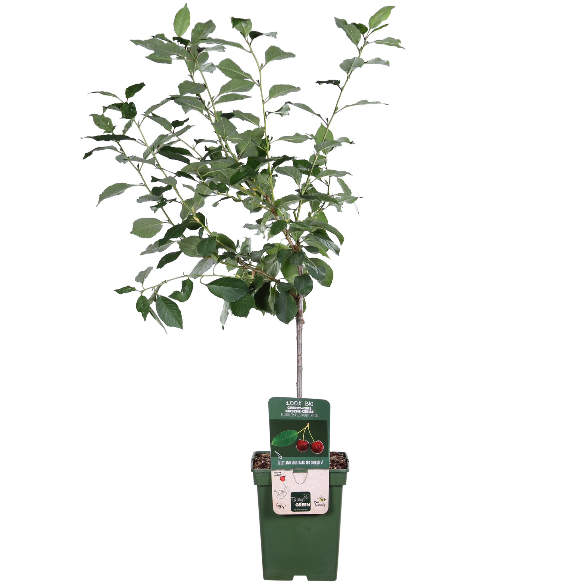 Le 'Prunus Cerasus Morellenfeuer' est une délicieuse variété de cerises au goût acidulé. Le cerisier fleurit en avril avec des fleurs blanches. Vers juillet, les fruits rouge foncé à longue tige peuvent être cueillis. Les cerises ne peuvent être conservées que peu de temps, elles sont donc particulièrement adaptées à la consommation directe. De plus, vous pouvez les transformer en confiture, en jus ou les utiliser comme garniture pour les glaces, les pâtisseries et les desserts. Elles contiennent beaucoup de glucides, de calcium et de vitamine C. Le cerisier pousse sur presque tous les types de sols. Il est important que le sol soit suffisamment humide et riche en nutriments. Plantez le cerisier dans un endroit ensoleillé, afin que les cerises reçoivent suffisamment de lumière du soleil. Taillez l'arbre après la récolte. Coupez les nouvelles branches qui ne font pas partie de la couronne de l'arbre. Voyez-vous des branches qui se croisent ? Coupez alors l'une de ces branches. Y a-t-il des branches qui n'ont pas porté de cerises cette année ? Taillez-les alors jusqu'au tronc. En bref, un cerisier facile à entretenir et adapté à tous les jardins.