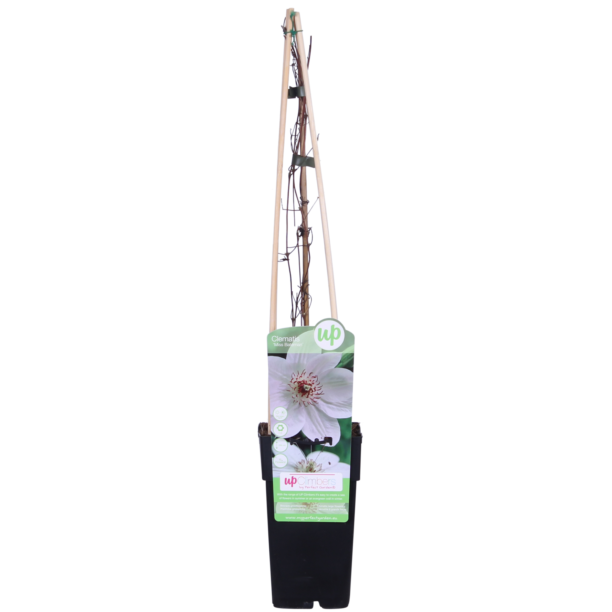 La 'Clematis miss Bateman' est une clématite à grandes fleurs qui produit de magnifiques fleurs blanches et constitue donc un véritable accroche-regard dans le jardin. Cette variété robuste fleurit deux fois par an. La première floraison a lieu vers mai-juin et la seconde entre juillet et septembre. Après la première floraison, il est préférable de la tailler pour qu'elle fleurisse une seconde fois. Sa croissance nette et compacte rend cette plante grimpante adaptée aux grands comme aux petits jardins. Après quelques années, la clématite atteint une hauteur d'environ 2 à 3 mètres. Pour que la clématite grimpe mieux, elle a besoin d'un peu d'aide. Il est préférable de guider la plante le long d'un treillis, d'un fil ou d'un tuteur. La clématite se porte donc très bien aussi bien à mi-ombre qu'au soleil. Cela rend une clématite adaptée à la plupart des endroits de votre jardin, très pratique ! Avec plus de soleil, la clématite fleurira plus abondamment. Les racines de la clématite doivent être à l'ombre et au frais. Assurez-vous que quelque chose pousse toujours au pied de la plante ou plantez la clématite plus profondément dans le sol, environ 10 cm plus profondément que la hauteur de la motte.