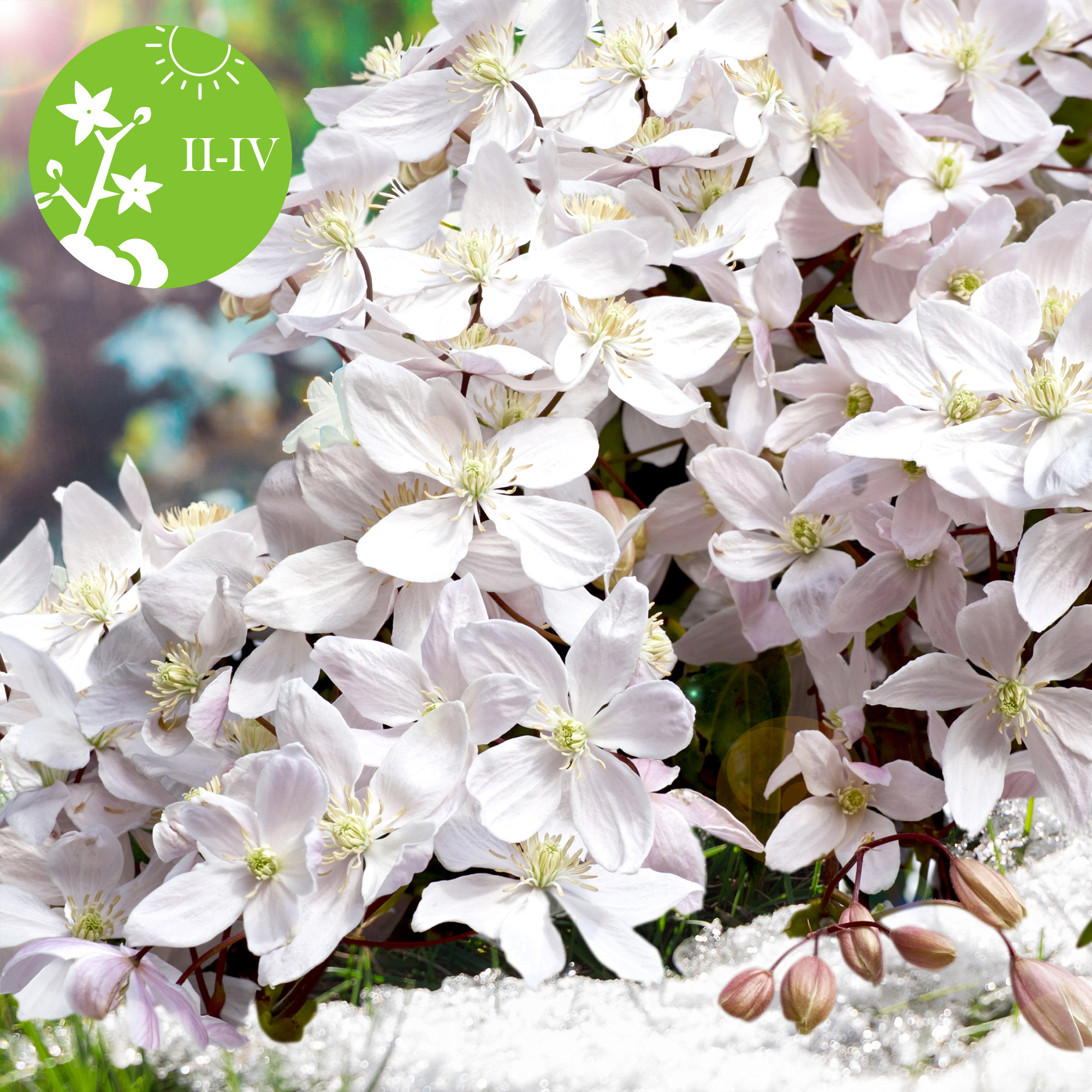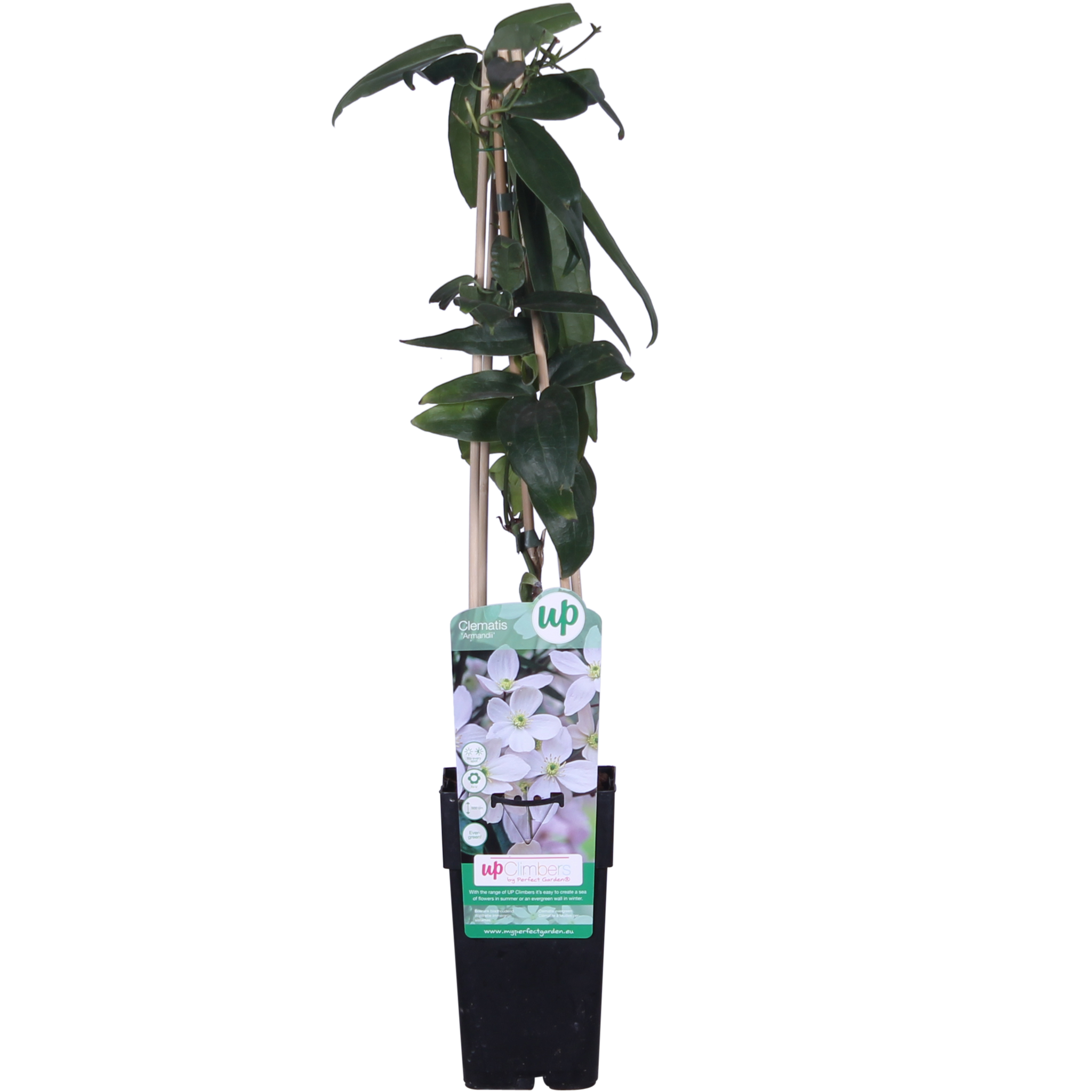 Clématite persistante ; La Clematis Armandii rustique est une clématite à petites fleurs qui fleurit dès la première année. L'Armandii est connue pour ses fleurs blanches délicieusement parfumées. La particularité de cette clématite est qu'elle est l'une des rares clématites à rester verte en hiver. La plante conserve donc sa valeur ornementale toute l'année. Ses feuilles vertes allongées et brillantes sont très élégantes et, avec son abondance de fleurs parfumées, vous sentirez le printemps arriver tôt dans votre jardin. Elle se plaît au soleil / mi-ombre. Il est préférable de tailler l'Armandii immédiatement après la floraison. Cette espèce peut pousser d'environ 2 à 3 mètres par an.