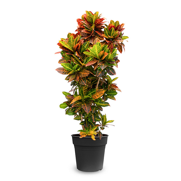 Le Croton Codiaeum, ou arbuste merveilleux, doit son nom néerlandais à ses grandes feuilles panachées, qui peuvent être blanches, jaunes, rouges, oranges et même violettes. Le Croton appartient à la famille des Crotoneae (Euphorbiaceae), ou en français : famille des Euphorbiacées. Ces plantes d'intérieur sont originaires d'Asie du Sud-Est.