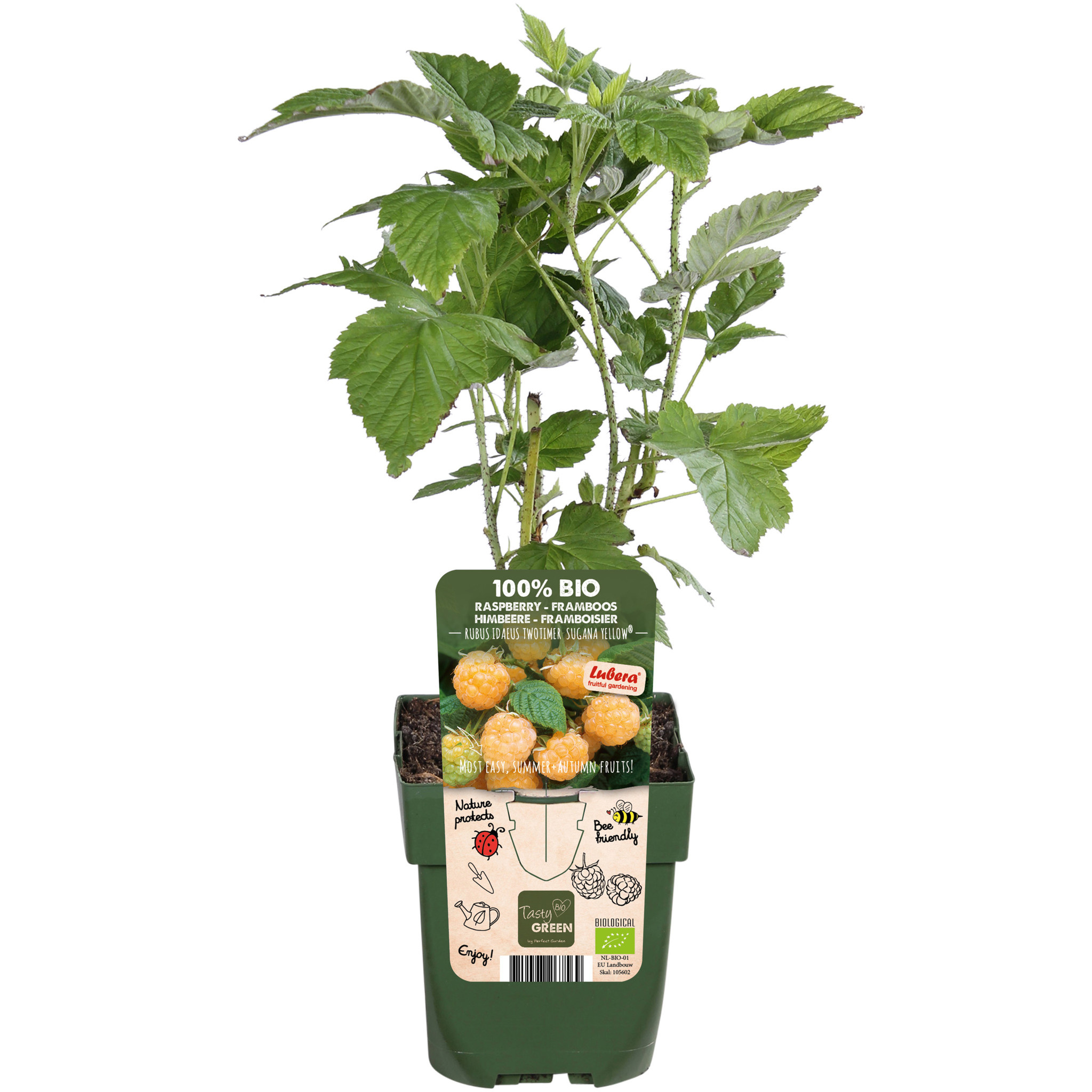 Tasty Green, fruits 100% biologiques. Cela signifie que seuls des matériaux végétaux et animaux ont été utilisés pendant la culture. Le pot et l'étiquette sont fabriqués à partir de plastique recyclé et constituent donc une solution propre pour l'environnement. Le 'Rubus Idaeus Twotimer Sugana Yellow' est le seul framboisier jaune qui donne des fruits deux fois par an. Un véritable atout pour votre jardin ! Les framboises sont délicieusement sucrées et ont une belle couleur jaune. Les framboises jaunes ont un goût plus doux et plus sucré que les framboises roses bien connues. Elles sont très saines, riches en antioxydants, minéraux et vitamines. L'arbuste pousse droit et peut atteindre environ 200 cm de hauteur. Cette espèce convient aux petits jardins, même pour le balcon. En juin, la première récolte a lieu sur les anciennes branches de l'arbuste, et à l'automne, la deuxième récolte sur les nouvelles branches.
