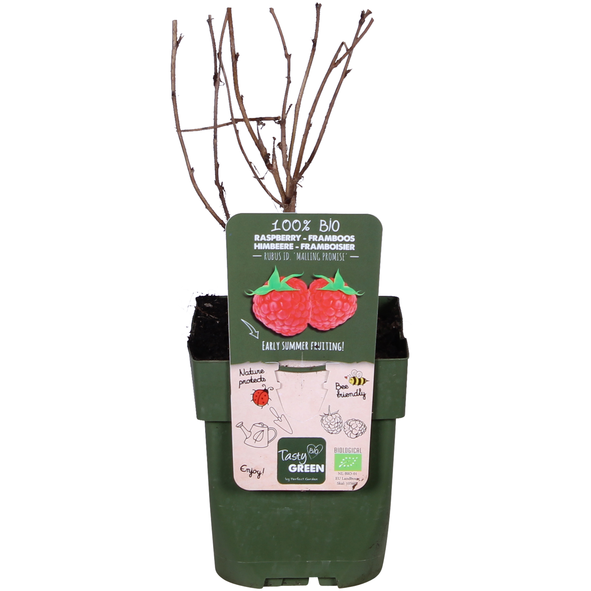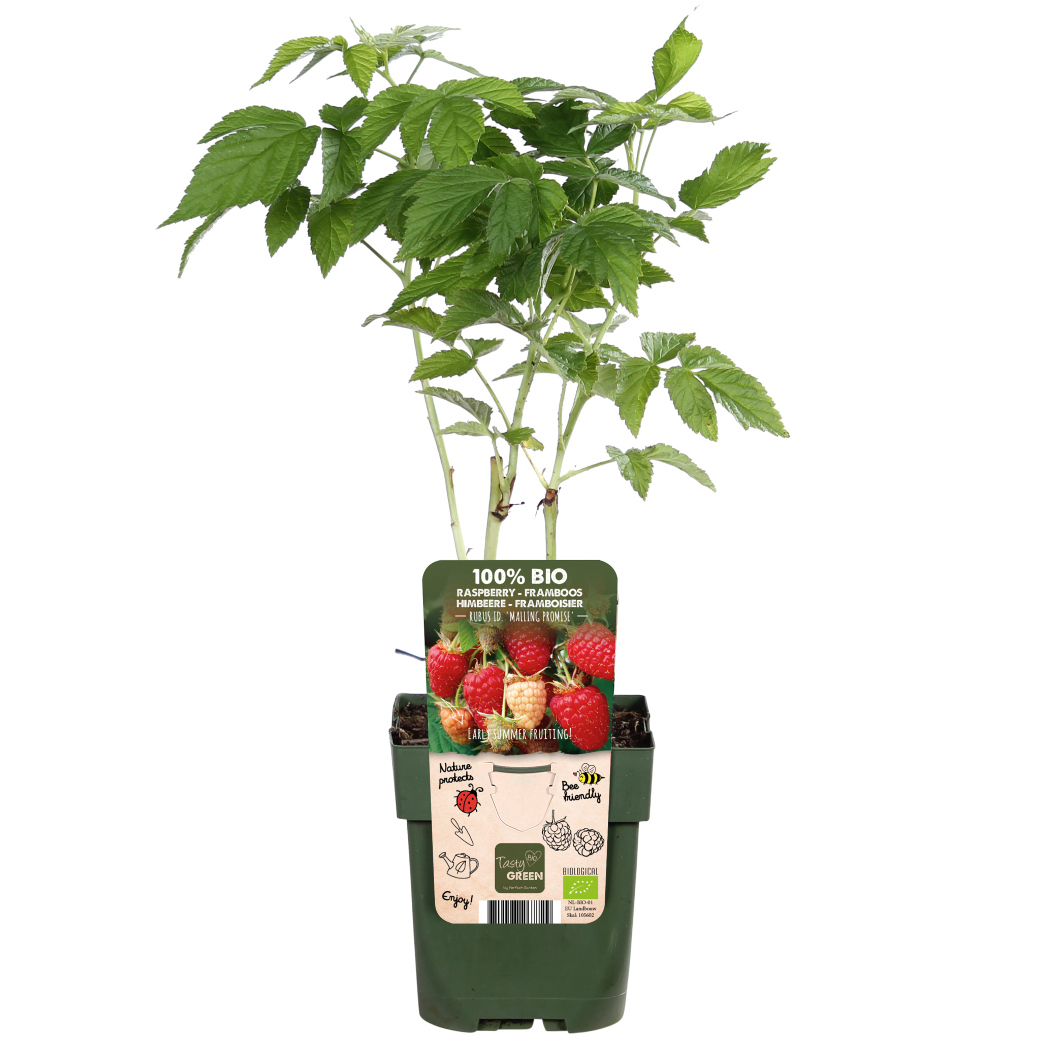 Tasty Green, fruits 100% biologiques. Cela signifie que seuls des matériaux végétaux et animaux sont utilisés pendant la culture. Le pot et l'étiquette sont fabriqués à partir de plastique recyclé et constituent donc une solution propre pour l'environnement. Le 'Rubus Idaeus Malling Promise' est l'une des variétés de framboises les plus connues. Ce framboisier est autofertile et fleurit à la fin du printemps avec de petites fleurs blanc-rose discrètes qui attirent les abeilles et les bourdons. Après la floraison, les framboises se développent. Les fruits sont assez doux et de couleur rouge vif et ont une saveur douce. Le 'Rubus idaeus Malling Promise' est un framboisier d'été, les fruits peuvent être cueillis à partir de juillet.