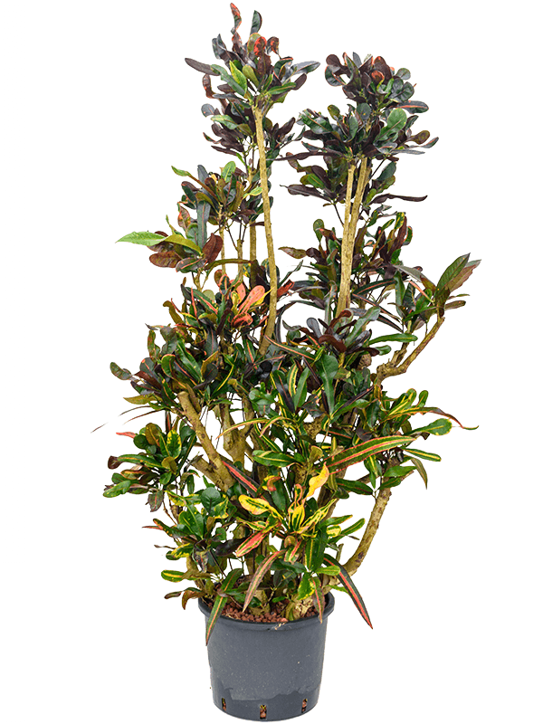 Le Croton Codiaeum ou Plante merveilleuse doit son nom néerlandais à ses grandes feuilles panachées, qui peuvent être blanches, jaunes, rouges, oranges et même violettes. Le Croton appartient à la famille des Crotoneae (Euphorbiaceae), ou en néerlandais : la famille des Euphorbiacées. Ces plantes d'intérieur sont originaires d'Asie du Sud-Est.