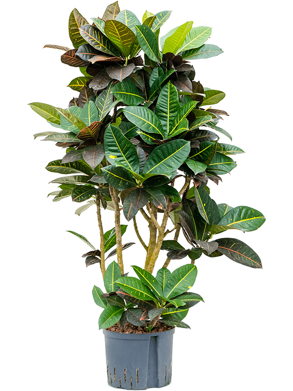 Le Croton Codiaeum, ou "Wonderstruik" (arbuste merveilleux) en néerlandais, doit son nom à ses grandes feuilles panachées, qui peuvent être blanches, jaunes, rouges, oranges et même violettes. Le Croton appartient à la famille des Crotoneae (Euphorbiaceae), ou en français : la famille des Euphorbiacées. Ces plantes d'intérieur sont originaires d'Asie du Sud-Est.