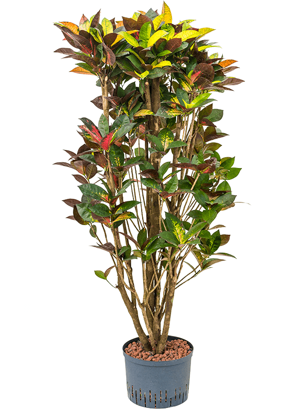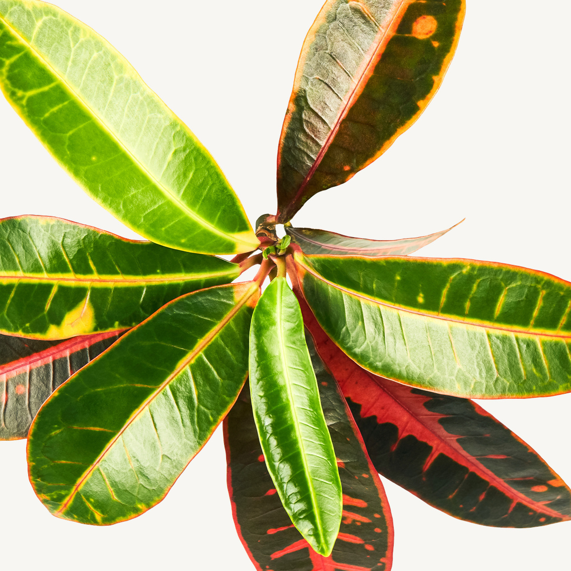 Le Croton Codiaeum, ou "Wonderstruik" (arbuste merveilleux), doit son nom néerlandais à ses grandes feuilles panachées, qui peuvent être blanches, jaunes, rouges, oranges et même violettes. Le Croton appartient à la famille des Crotoneae (Euphorbiaceae), ou en français : la famille des Euphorbiacées. Ces plantes d'intérieur sont originaires d'Asie du Sud-Est.