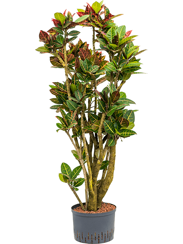 Le Croton Codiaeum ou Buis merveilleux doit son nom néerlandais à ses grandes feuilles panachées, qui peuvent être blanches, jaunes, rouges, oranges et même violettes. Le Croton appartient à la famille des Crotoneae (Euphorbiaceae), ou en français : famille des Euphorbiacées. Ces plantes d'intérieur sont originaires d'Asie du Sud-Est.
