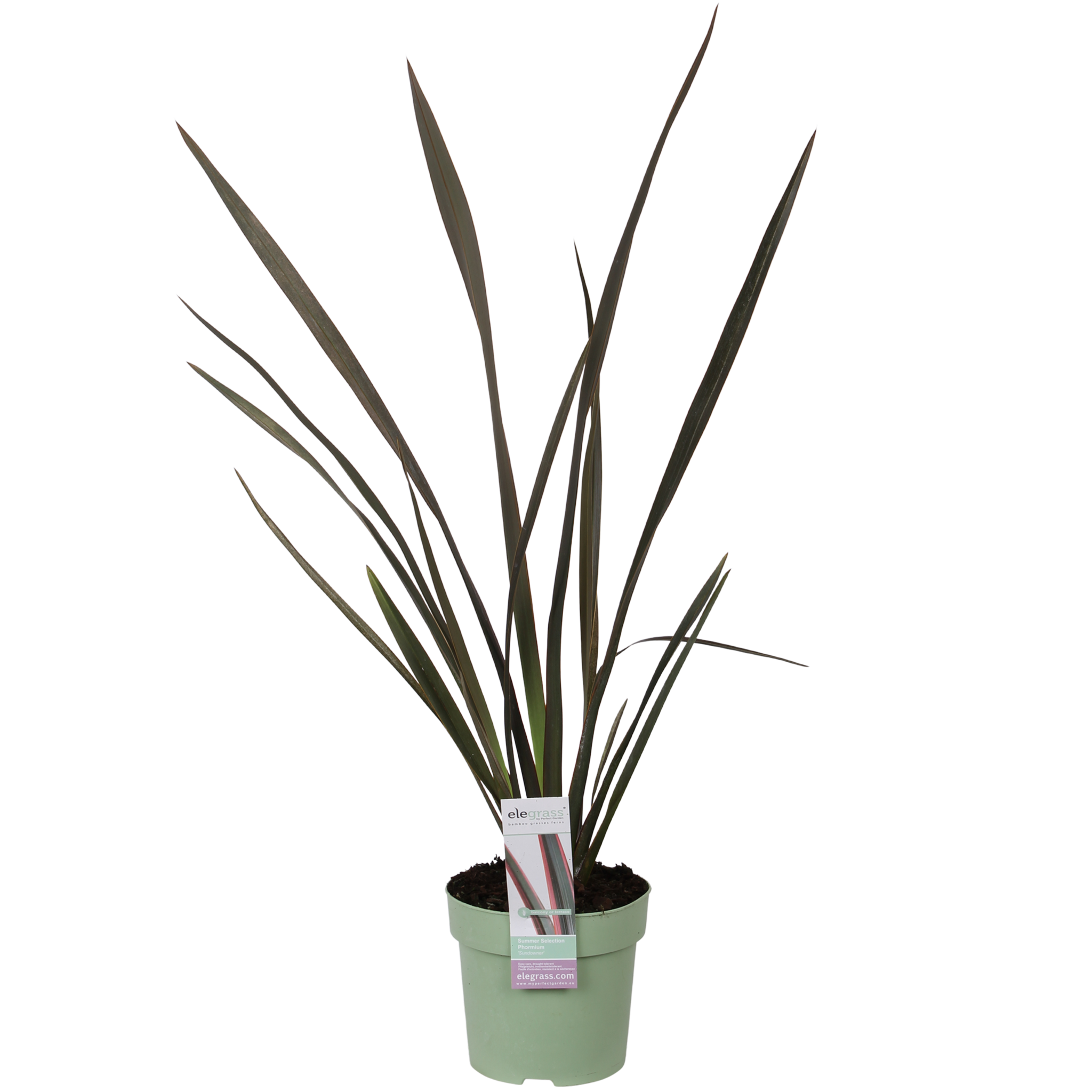 Le « Phormium tenax Sundowner », appelé Lin de Nouvelle-Zélande en néerlandais, est une plante exotique persistante et possède des feuilles rigides et en forme d'épée caractéristiques. Ses feuilles dressées sont vert bronze rayées de bords roses. Après quelques années, ce Phormium peut fleurir avec de remarquables panicules florales hautes et des fleurs tubulaires, rouge foncé, pendant les mois de juillet et août. Malheureusement, la plante fleurit rarement dans notre climat maritime. Le Phormium est rustique et persistant, ce qui en fait un ajout coloré à votre jardin d'hiver. Cette plante est facile d'entretien et résiste à la chaleur et à la sécheresse. Le Phormium est le plus beau en tant que solitaire accrocheur, mais il se porte également bien en groupes. La plante n'a pas besoin d'être taillée, mais vous pouvez couper les feuilles mortes. Le Phormium se plaît le mieux dans un endroit abrité, dans un sol sec à humide, riche en nutriments, en plein soleil ou à l'ombre légère.