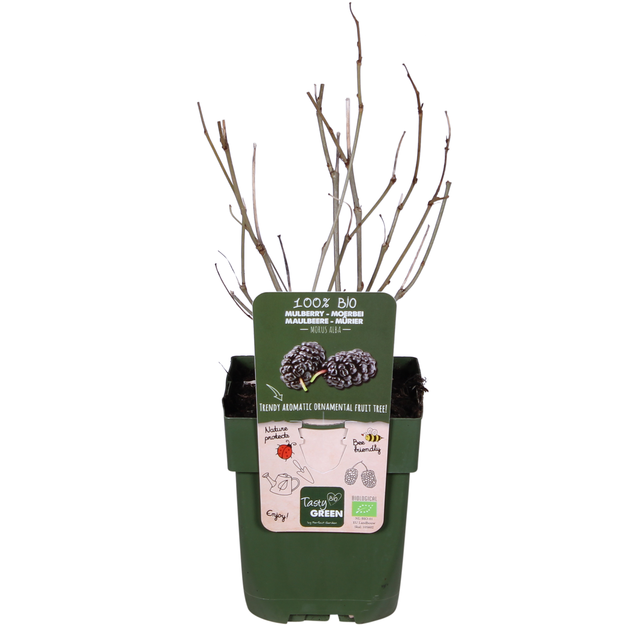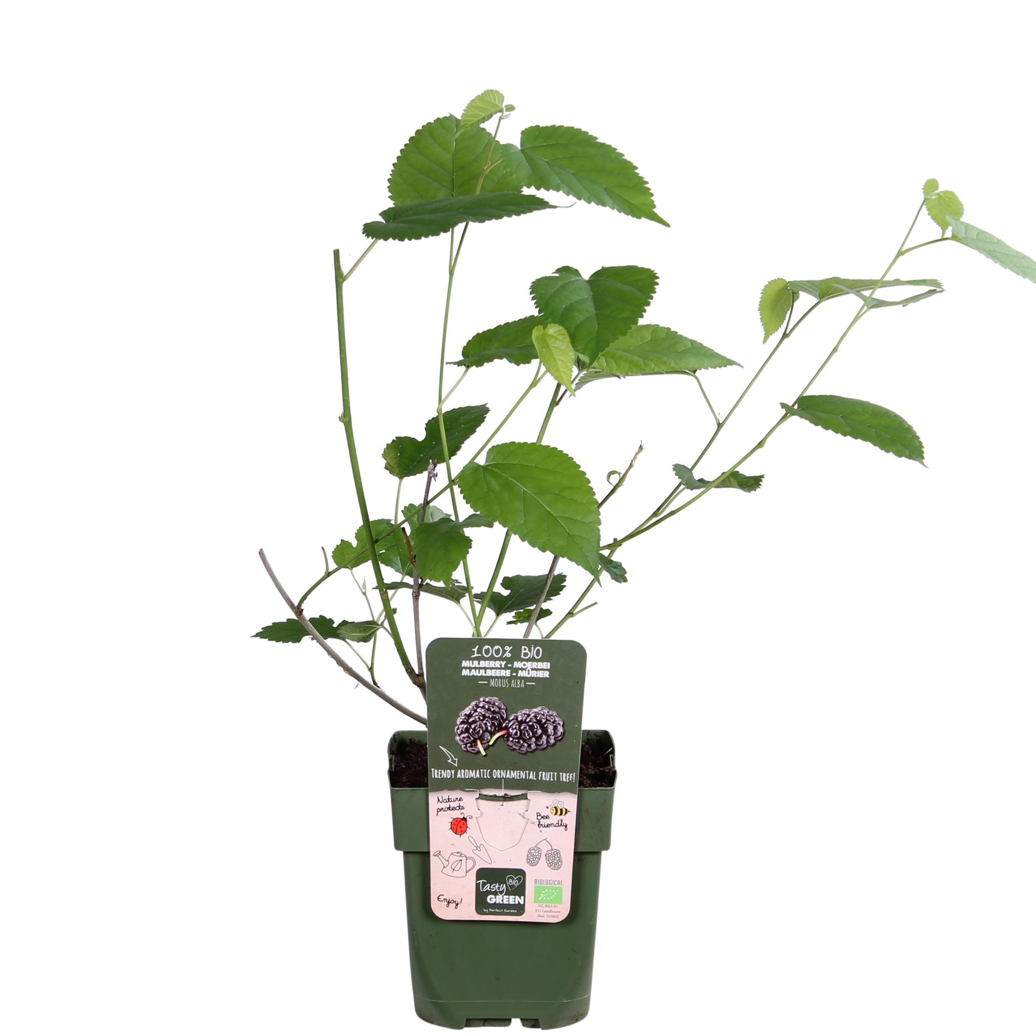 Tasty Green, fruits 100% issus de l'agriculture biologique. Cela signifie que seuls des matériaux végétaux et animaux ont été utilisés pendant la culture. Le pot et l'étiquette sont fabriqués à partir de plastique recyclé et constituent donc une solution propre pour l'environnement. Le 'Morus Nigra Mulle' est un mûrier noir. L'arbre est très caractéristique par ses branches et ses feuilles vert foncé en forme de cœur. En mai, le mûrier noir fleurit avec une floraison blanche. En automne, des fruits rouge-noir apparaissent sur les branches. Ils sont d'abord verts, puis deviennent rouges et sont noir-rouge à pleine maturité. Ils ressemblent à des framboises et ont un goût légèrement sucré et aromatique. Les fruits sont sains, riches en fibres, en vitamines et en antioxydants. Vous pouvez les manger frais, les sécher ou les transformer en confiture et en jus.