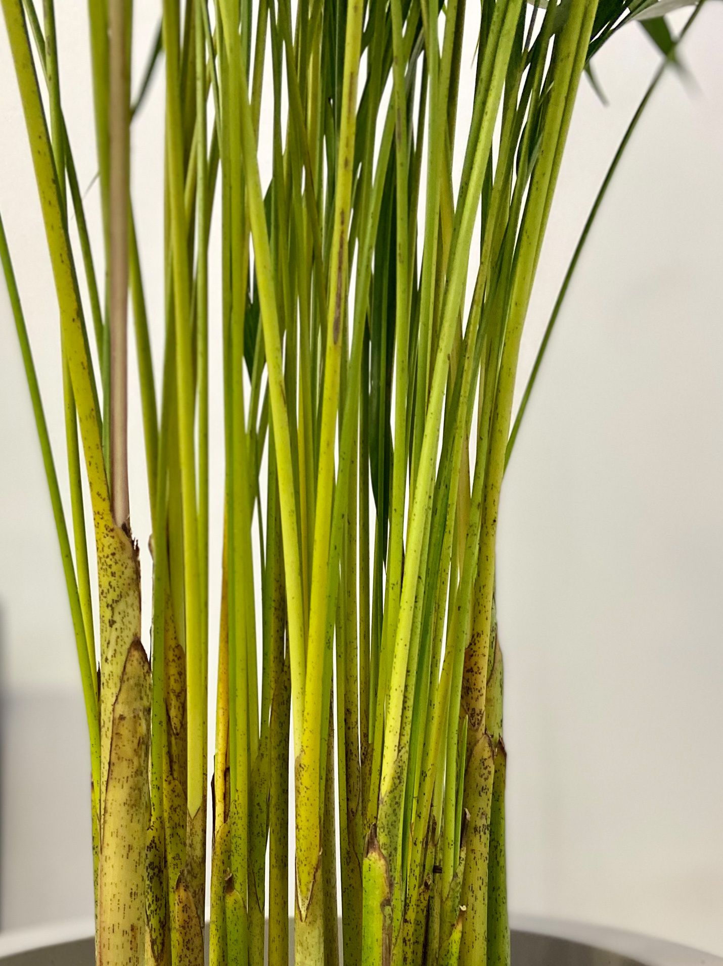 Le Palmier doré aime une bonne quantité d'eau. Et préfère un sol humide. Il est préférable d'arroser la plante un peu plus souvent dans la semaine, plutôt que beaucoup en une seule fois. La plante ne peut pas absorber trop d'eau assez rapidement, ce qui peut entraîner la pourriture des racines due à l'eau stagnante au fond. Vous pouvez fertiliser le palmier avec de l'engrais pour 'palmiers'. Ne le faites pas pendant les mois de décembre et janvier, car l'Aréca, comme tout arbre, hiberne alors. Le palmier aime renouveler ses feuilles. De nouvelles pousses apparaissent, mais la plante rejette également ses feuilles inférieures. Si ses feuilles inférieures commencent à brunir, il est préférable de les couper aussi près que possible de la tige, afin que le palmier n'ait plus à dépenser d'énergie dans les vieilles feuilles, mais ait une force supplémentaire pour les nouvelles.