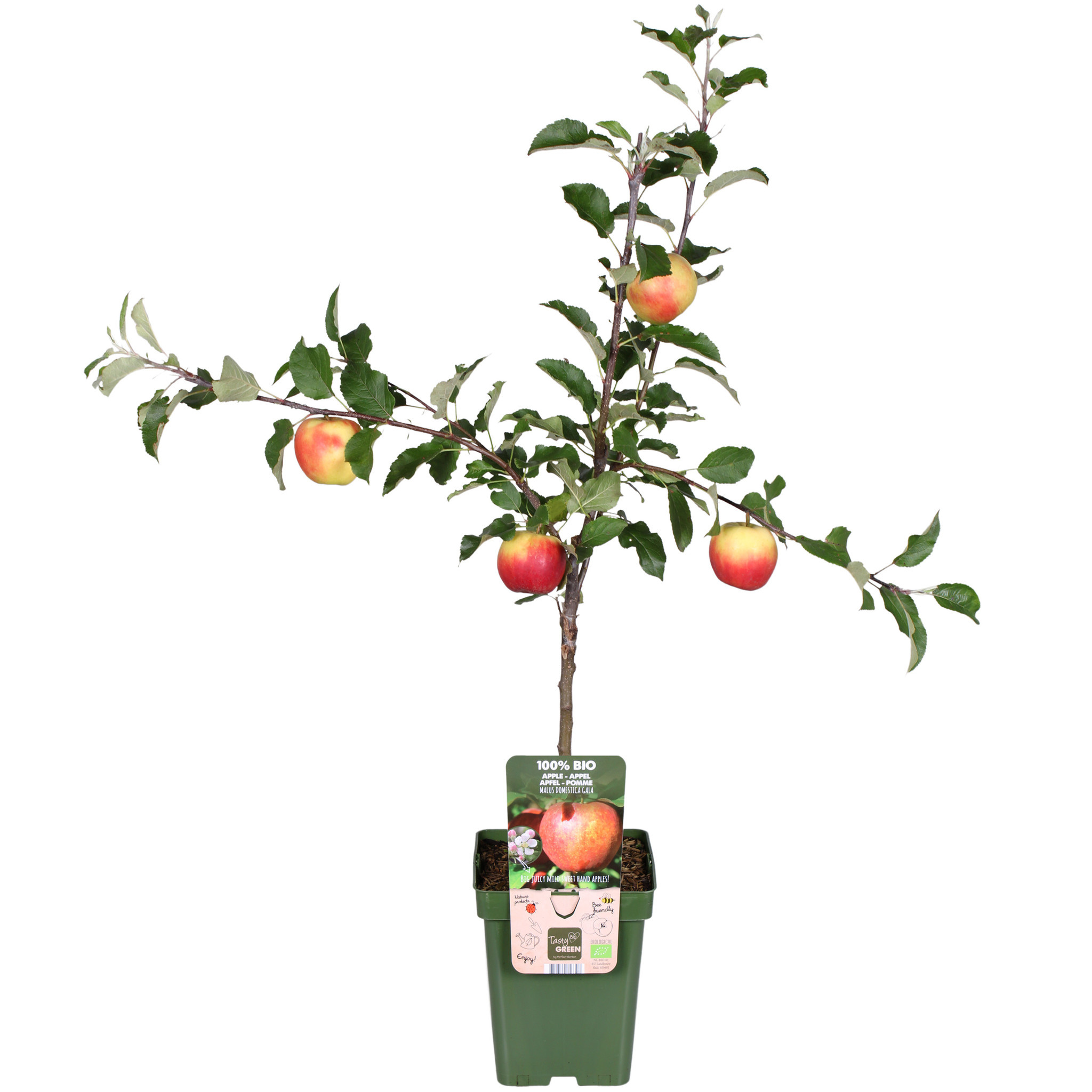 Tasty Green, fruits 100% biologiques. Cela signifie que seuls des matériaux végétaux et animaux ont été utilisés pendant la culture. Le pot et l'étiquette sont fabriqués à partir de plastique recyclé et constituent donc une solution propre pour l'environnement. Le 'Malus Domestica Gala' est un pommier aux fruits juteux et sucrés. La faible teneur en acide de la pomme fait que les enfants l'apprécient également beaucoup. Les pommes peuvent être cueillies de fin septembre à début octobre et se conservent assez bien. L'arbre préfère un endroit ensoleillé et abrité et, de préférence, à proximité d'une autre variété de pommier pour la pollinisation.