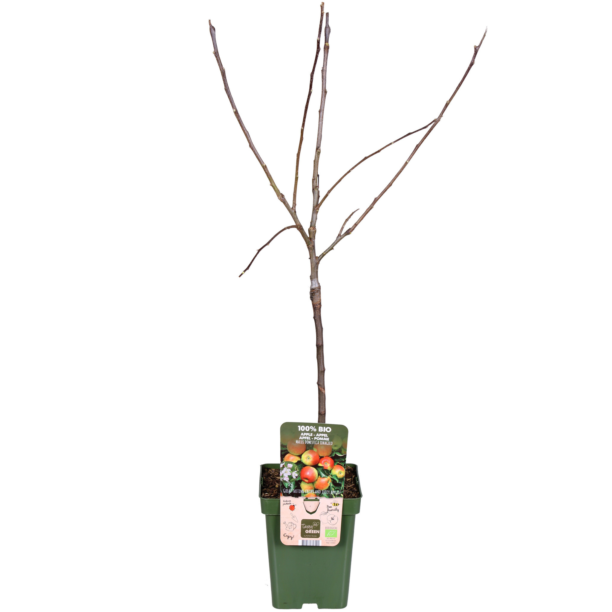 Tasty Green, des fruits 100% issus de l'agriculture biologique. Cela signifie que seuls des matériaux végétaux et animaux ont été utilisés pendant la culture. Le pot et l'étiquette sont fabriqués à partir de plastique recyclé et constituent donc une solution propre pour l'environnement. Le 'Malus domestica Jonagold' est une variété de pomme très connue. Donnez à l'arbre l'espace nécessaire pour grandir. Il fleurit en avril et mai avec des fleurs blanc-rose qui se transforment en pommes savoureuses. Le fruit est gros et de couleur rouge-jaune avec une chair juteuse jaune-blanc. Le goût est légèrement sucré et doucement acidulé. Les pommes contiennent beaucoup de fibres alimentaires, de vitamines et d'antioxydants.