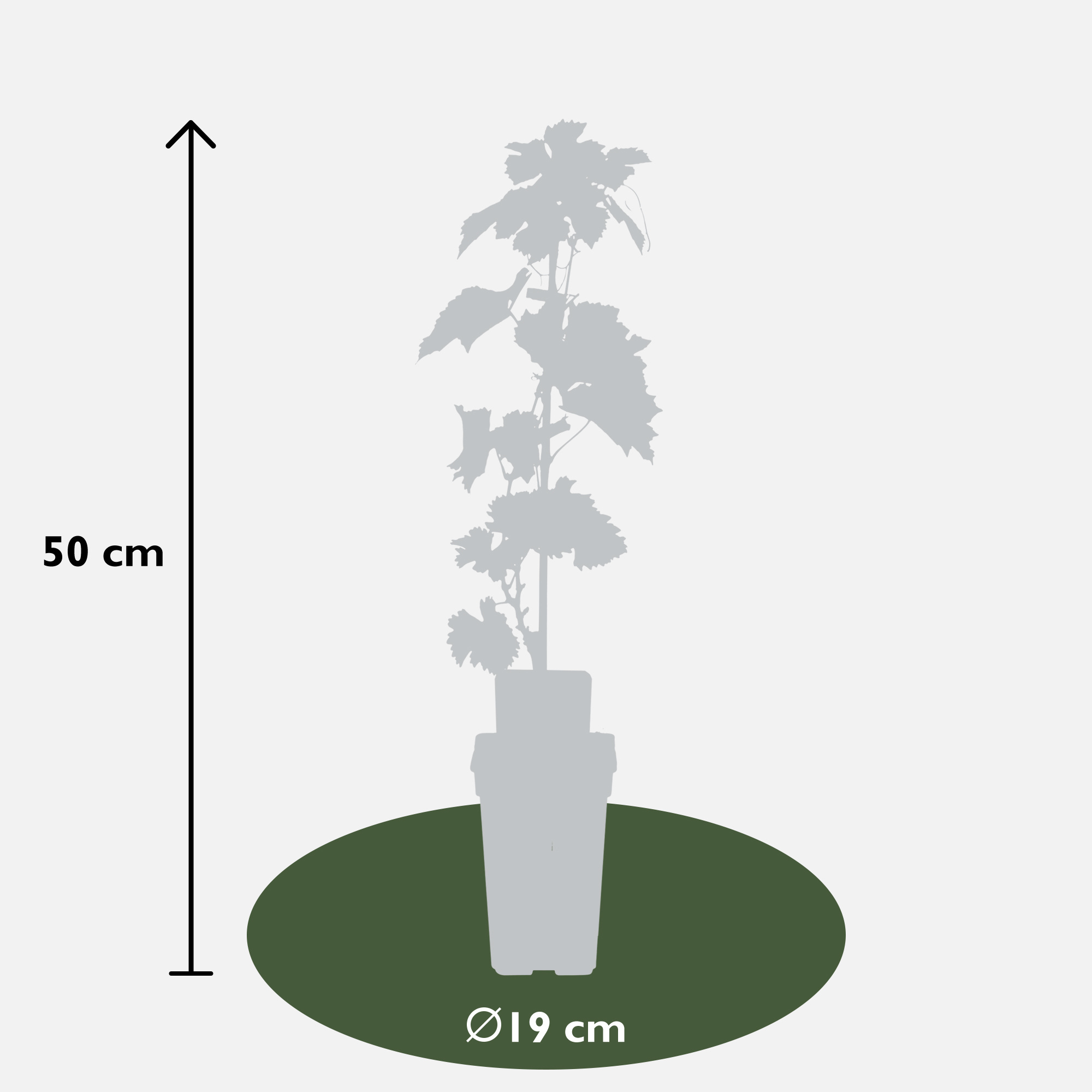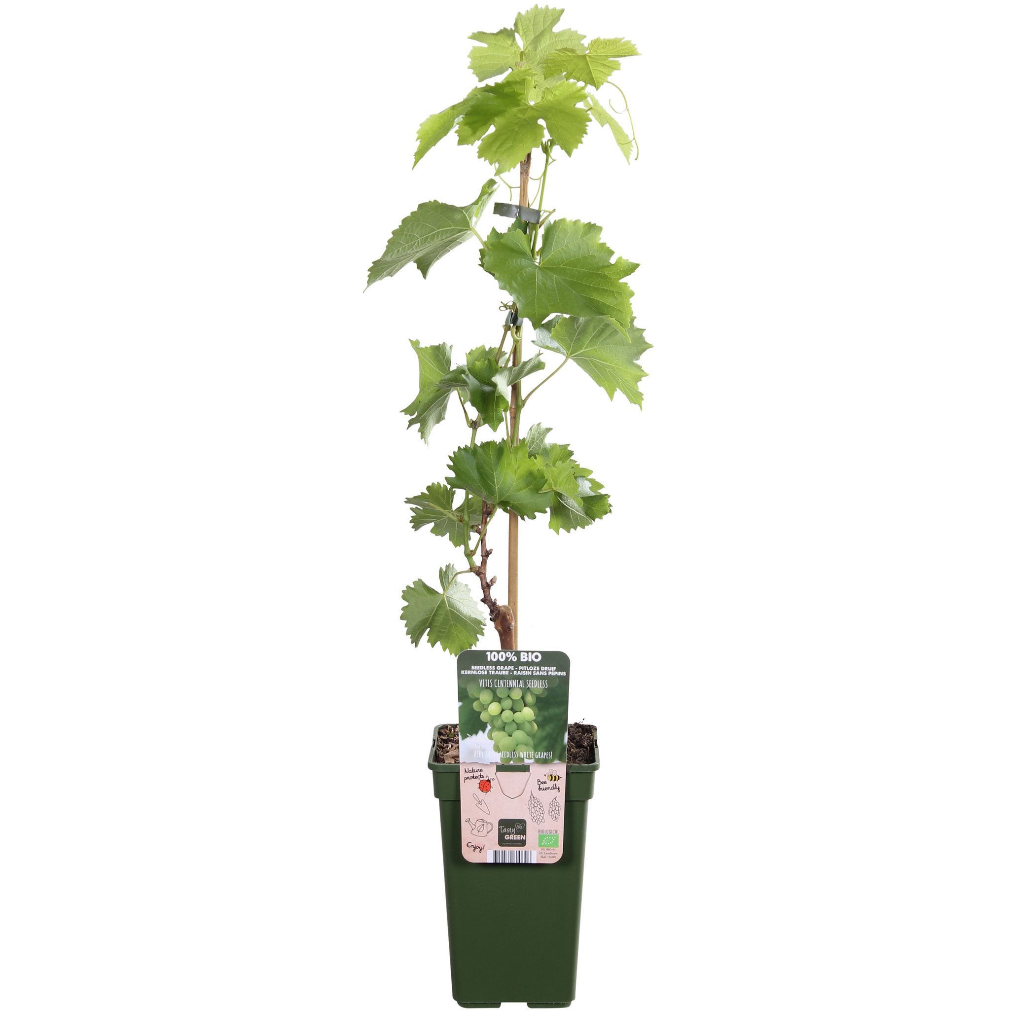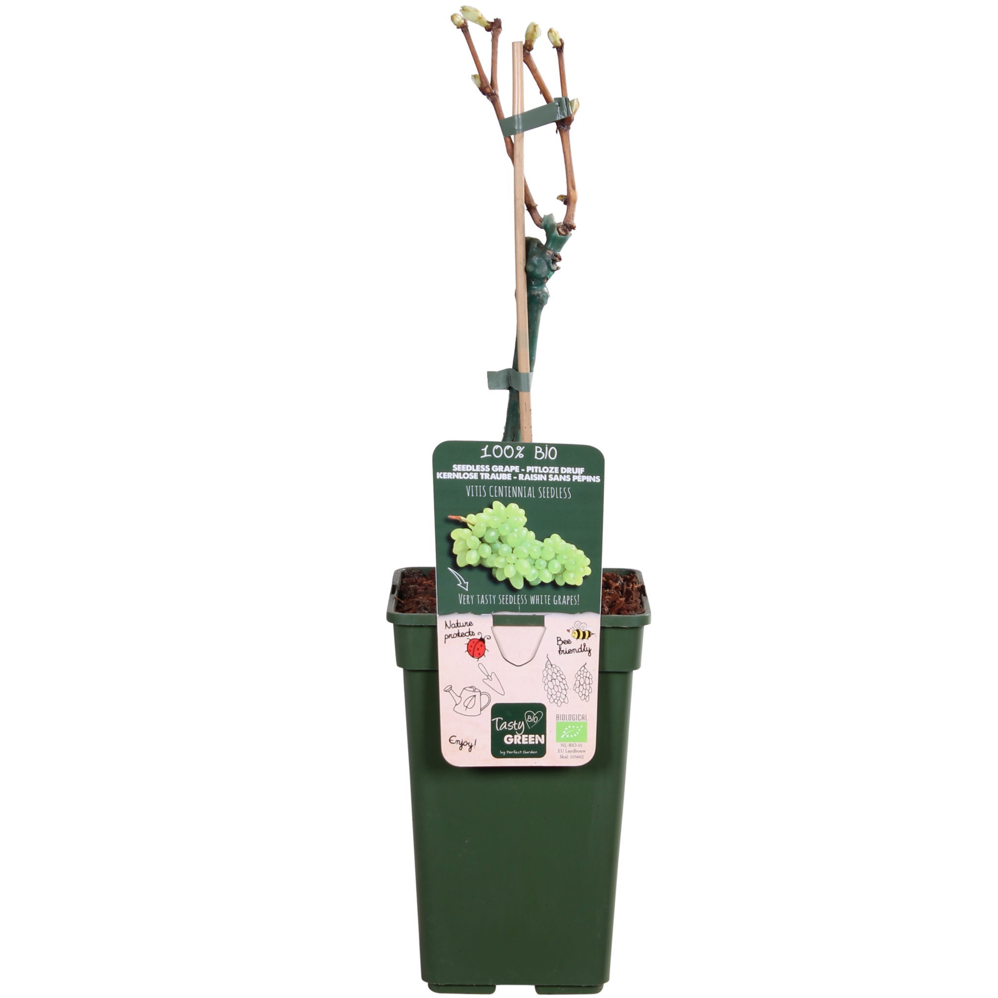 Tasty Green, fruit 100% biologique. Cela signifie que seuls des matériaux végétaux et animaux ont été utilisés pendant la culture. Le pot et l'étiquette sont fabriqués à partir de plastique recyclé et constituent donc une solution propre pour l'environnement. 'Vitis vinifera Centennial Seedless' est un raisin blanc sans pépins avec des baies fermes et une douce saveur de muscat. En raison de la quantité de soleil et de chaleur dont ce raisin a besoin, il est préférable de le cultiver sous serre afin qu'il puisse donner une bonne récolte. C'est une plante grimpante qui peut atteindre plusieurs mètres de hauteur. Vous pouvez la guider vous-même sous diverses formes et la maintenir très compacte en la taillant bien. Vous pouvez bien guider le raisin le long d'une pergola ou avec des fils tendus sur le mur. Le raisin donne d'abord des grappes de fleurs discrètes en mai-juin, après quoi les grappes de raisins se formeront. Les fruits sont de couleur blanc-vert, avec une saveur douce et aromatique. Vous pouvez les manger directement ou les utiliser pour faire de la confiture, du jus ou du vin. La vigne a besoin de beaucoup de soleil pour mûrir et aime la chaleur, ce qui rend un emplacement au sud idéal.