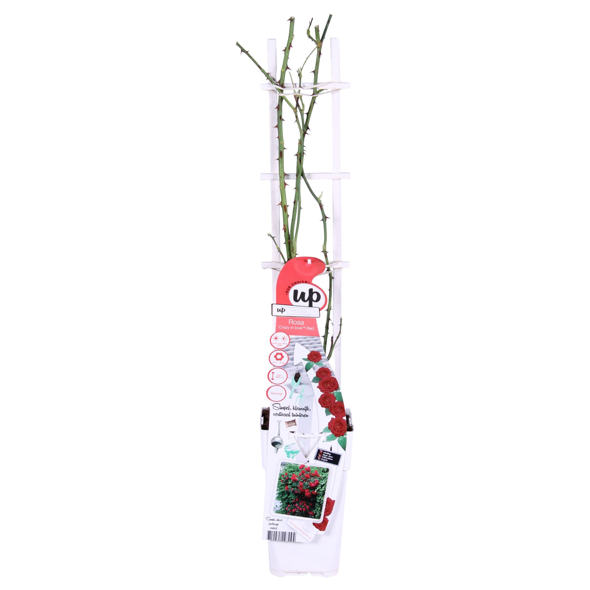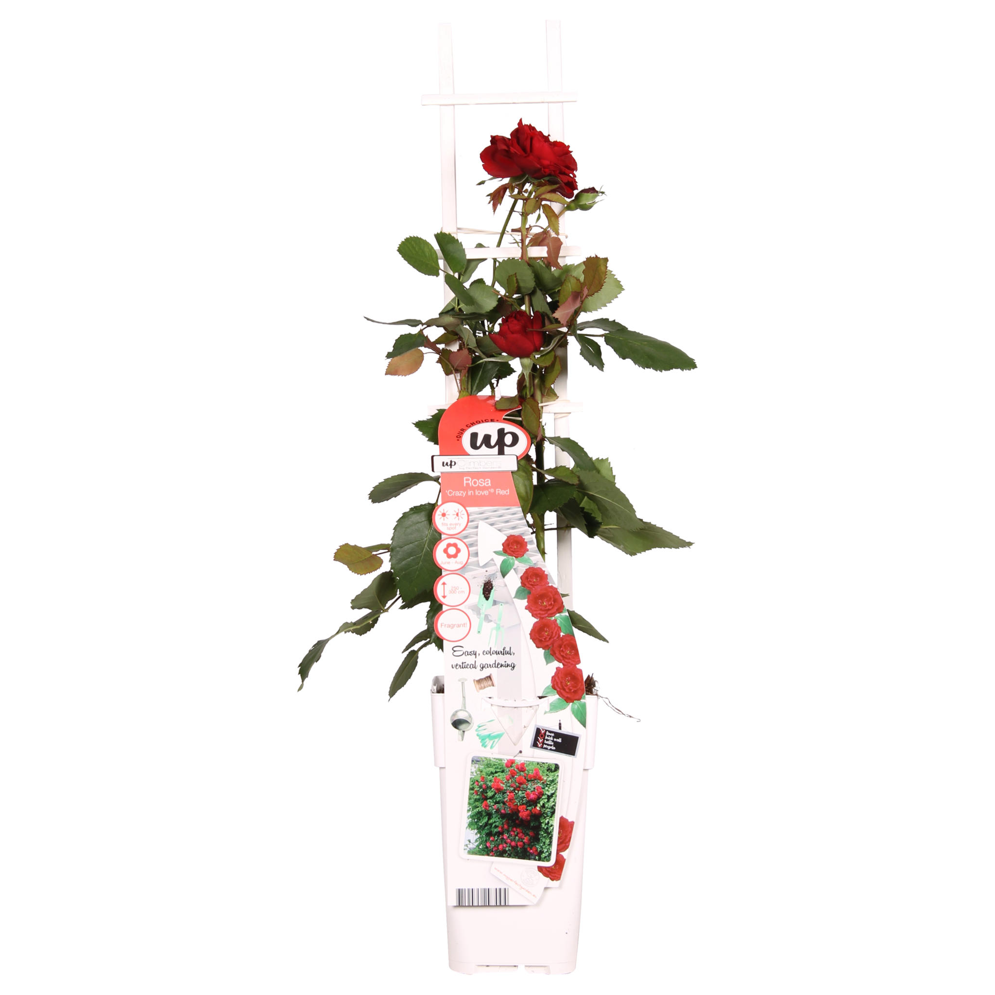 ‘Rosa Crazy in love Red’ est un rosier grimpant rouge populaire avec des feuilles vert vif et brillantes. Les roses font partie des groupes de plantes les plus connus et les plus plantés depuis des centaines d'années. La rose, en particulier la rouge, a une valeur symbolique dans différentes cultures. Dès l'Antiquité, elle était utilisée pour décorer les temples et les palais. Selon la mythologie gréco-romaine, les premières roses rouges sont nées du sang d'Adonis pour son amour envers Aphrodite/Vénus. Jusqu'alors, les roses auraient été blanches. Les roses rouges sont encore aujourd'hui connues comme un symbole d'amour. La rose commence à fleurir en juin et continue de fleurir jusqu'aux premières gelées en octobre ou novembre. Pour stimuler la floraison, il est conseillé d'enlever les fleurs anciennes et fanées. Le rosier grimpant aime un emplacement ensoleillé, et pour une croissance optimale, il est préférable de le tailler tous les ans à environ 30 centimètres du sol.