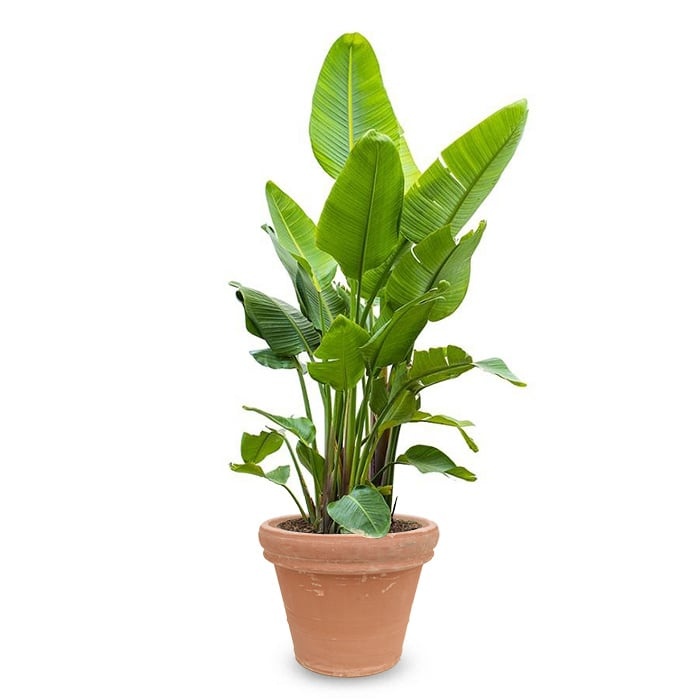 Le Strelitzia est une plante extrêmement populaire grâce à ses magnifiques éventails, ses feuilles imposantes qui poussent vers le haut. Cette plante est donc souvent un point d'attraction dans la pièce et apporte une ambiance jungle à l'intérieur.