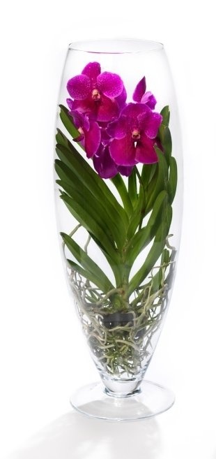 En plaçant le Vanda dans un vase cylindrique, vous pouvez bien voir toutes les parties de la plante. Il est également plus facile d'arroser les racines aériennes de cette manière, sans que l'eau ne se retrouve sur votre sol ou votre table.