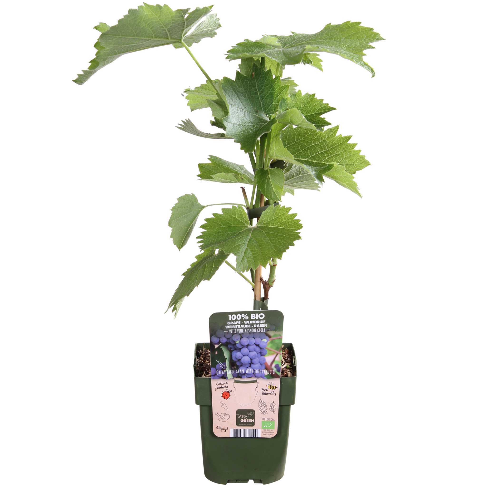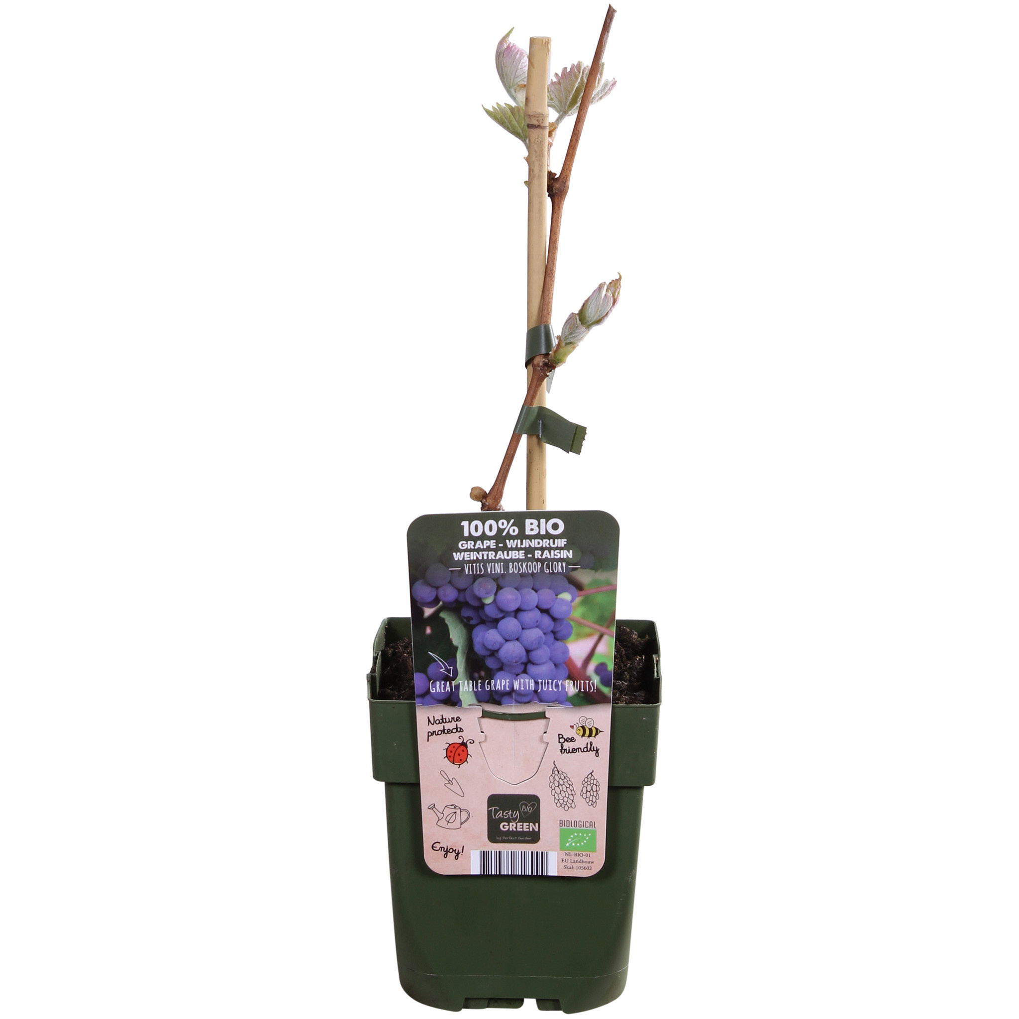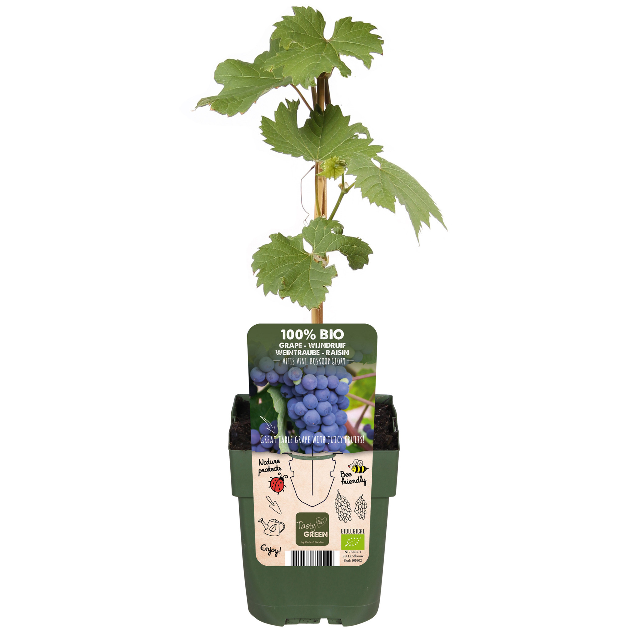Tasty Green, fruits 100% biologiques. Cela signifie que seuls des matériaux végétaux et animaux ont été utilisés pendant la culture. Le pot et l'étiquette sont fabriqués à partir de plastique recyclé et constituent donc une solution propre pour l'environnement. 'Vitis Boskoop Glory' est une variété de vigne connue et largement utilisée pour le jardin. C'est une plante grimpante qui peut atteindre plusieurs mètres de hauteur. Vous pouvez la guider vous-même dans toutes sortes de formes et la maintenir très compacte en la taillant bien. Vous pouvez facilement guider la vigne le long d'une pergola ou avec des fils tendus sur le mur. La vigne produit d'abord des grappes de fleurs discrètes en juillet-août, après quoi les grappes de raisins bleus se formeront. Les fruits sont de couleur bleue, juteux avec un goût sucré. Vous pouvez les manger directement ou les utiliser pour faire de la confiture, de la gelée ou du vin. La vigne a besoin de beaucoup de soleil pour mûrir et aime la chaleur, c'est pourquoi un emplacement au sud est idéal.