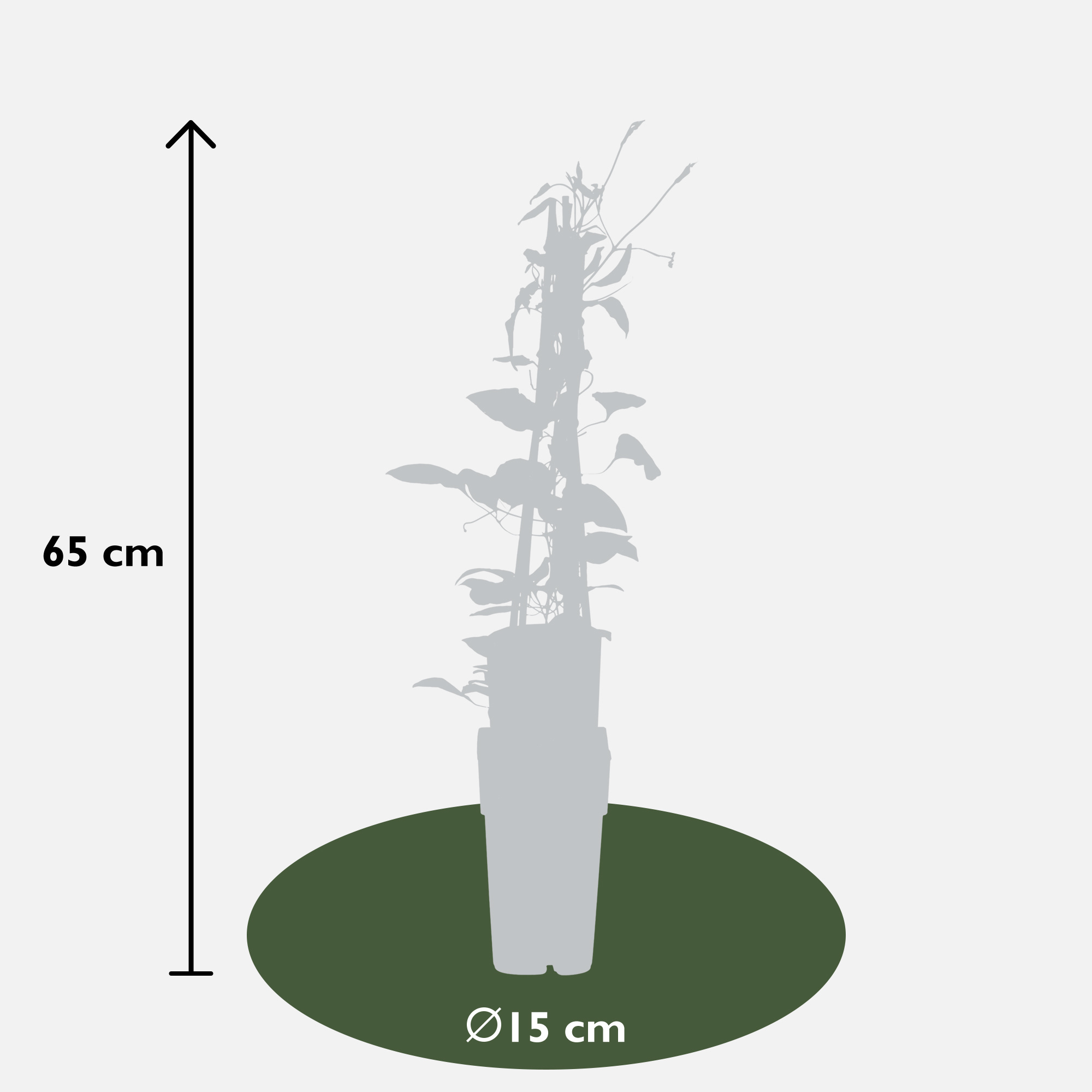 ‘Clematis Rouge Cardinal’ is een grootbloemige clematis met donkerrode tot diep-purperrode bloemen. Deze bloemen verschijnen rond mei- juni. De plant zelf kan tot wel 3,5 m hoog worden en heeft tamelijk lichtgroen blad. De clematis is winterhard, maar wel bladverliezend. Snoeien van deze plant is niet noodzakelijk maar kan wel als hij bijvoorbeeld te groot wordt. Doordat deze grootbloemige clematis vrij vroeg bloeit is het aan te raden pas na de bloei te snoeien. Om de clematis beter te laten klimmen heeft hij een beetje hulp nodig. Het beste kun je de plant dan ook langs een rek, draad of stok omhoog leiden. De clematis doet het dus zowel in de halfschaduw als in de zon erg goed. Dit maakt de clematis geschikt voor de meeste plekken in je tuin, erg handig! Bij meer zon zal de clematis wel rijkelijker bloeien. De wortels van de clematis moeten wel in de schaduw en koelte staan. Zorg dat er altijd iets voor de voet van de plant groeit en plant de clematis dieper in de grond. Zo wordt hij beschermd tegen de vervelende verwelkingziekte die de bovengrondse stengels kan aantasten, onder de grond blijft de plant gezond. Als dit gebeurd kan hij daardoor altijd weer gezond uitlopen.