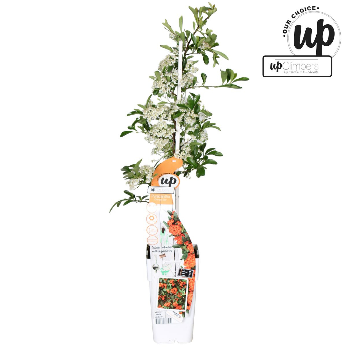 ‘Pyracantha coccinea Orange Star’ is een echte ster binnen het vuurdoorn assortiment. Deze vuurdoorn heeft minder doorns en meer bessen dan andere soorten. Het is een wintergroene heester die in juni bloeit met witte bloemen. Op de bloei komen dan ook vlinders en bijen af. Deze bloemen veranderen daarna in bessen welke vanaf september oranje kleuren. Vogels zijn ook gek op deze bessen. Hun mooie, heldere intense kleur blijft zeker tot na de kerst. Het is daarom ook een prachtig kerst-item. De plant draagt rijkelijk vrucht op tweejarig hout. Doordat hij enkel op tweejarig hout bloeit is het af te raden om deze struik veel te snoeien. Je kan de Pyracantha neerzetten als solitair in een mooie grote pot op het balkon of terras. Verder is hij ook zeker geschikt in de tuin en zelfs als haag. De plant heeft ondersteuning nodig om te klimmen, hij groeit namelijk als een gewone struik en moet daarom wel vastgebonden worden. Een plek in de zon of halfschaduw is goed voor deze heester en aan de grondsoort stelt hij weinig eisen, elke normale tot vochtige grond is geschikt. Hij is zeer winterhard tot wel -30 graden.