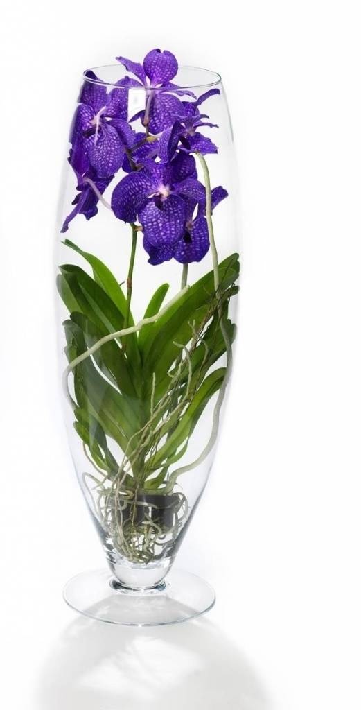 Door de Vanda in een Champagne vaas te zetten kunt u alle onderdelen van de plant goed zien. Ook is het gemakkelijker om de luchtwortels op deze manier water te geven, zonder dat er water op uw vloer of tafel terecht komt.